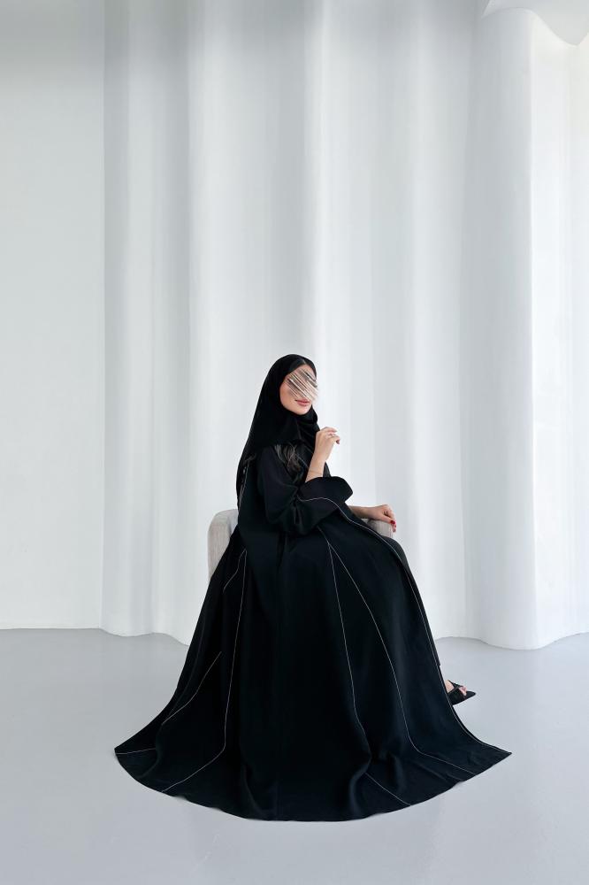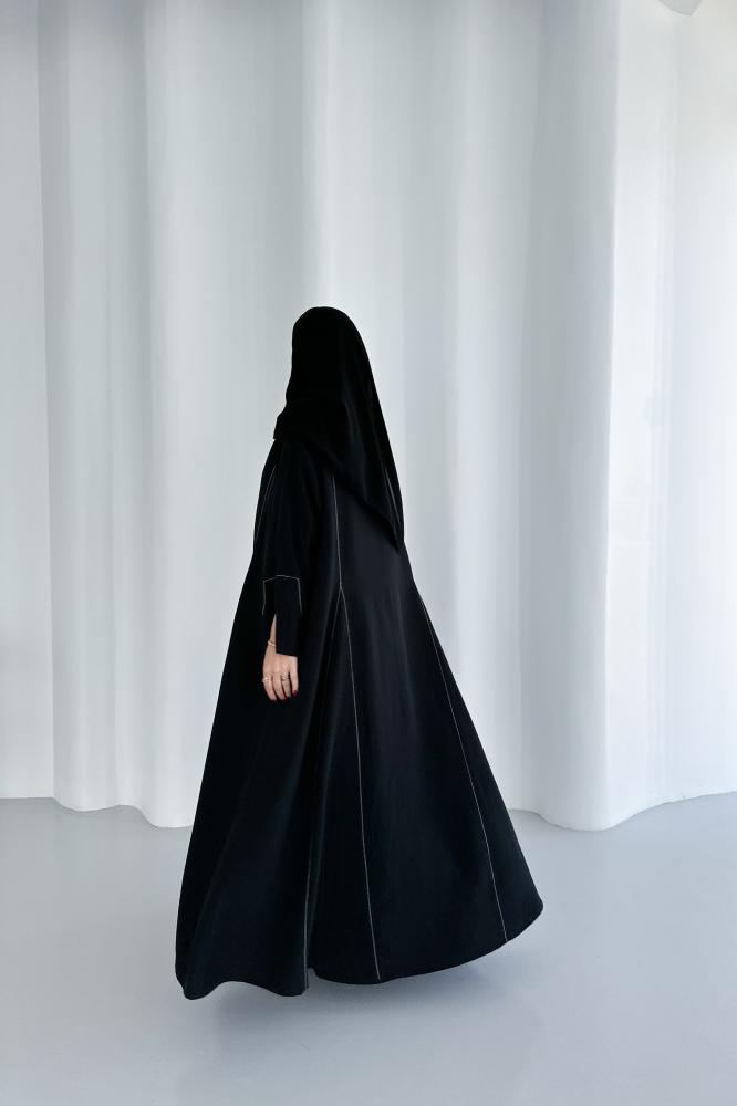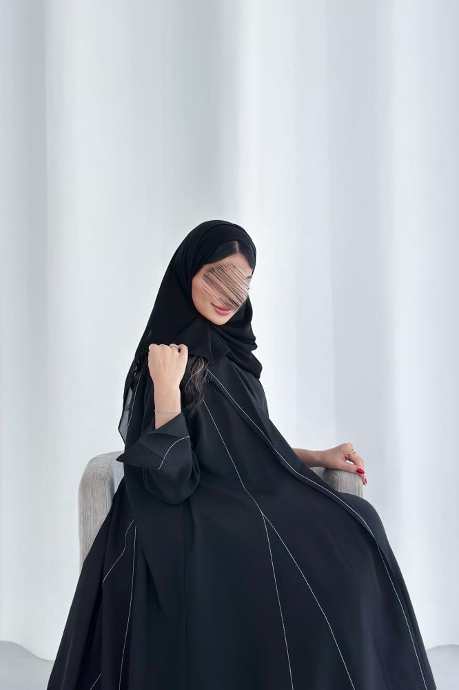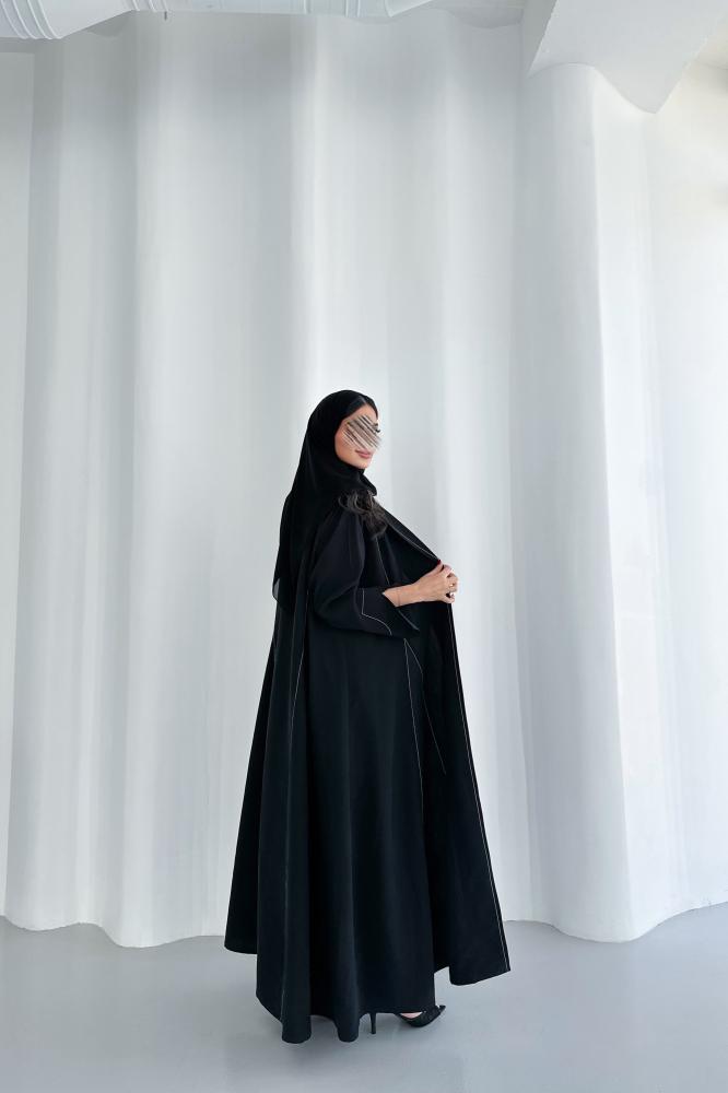 عباية كريب مغسول باللون الأسود مع تطريز أبيض قصة بليزر