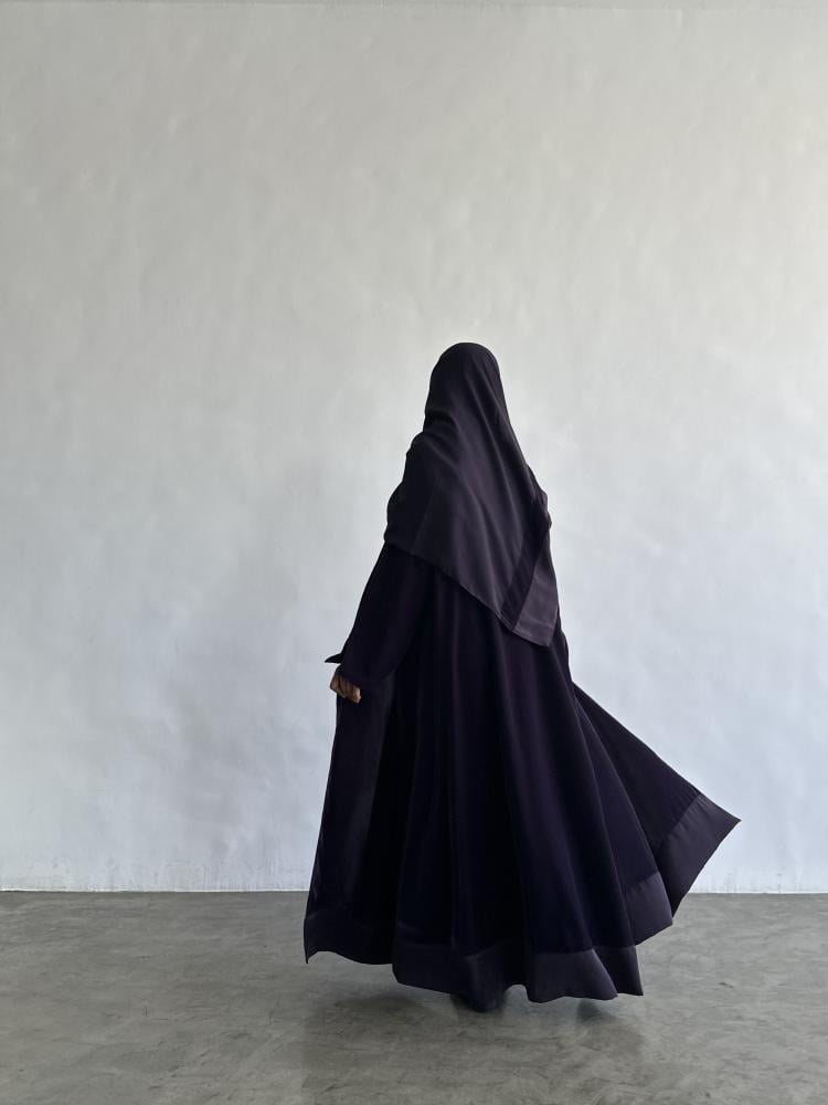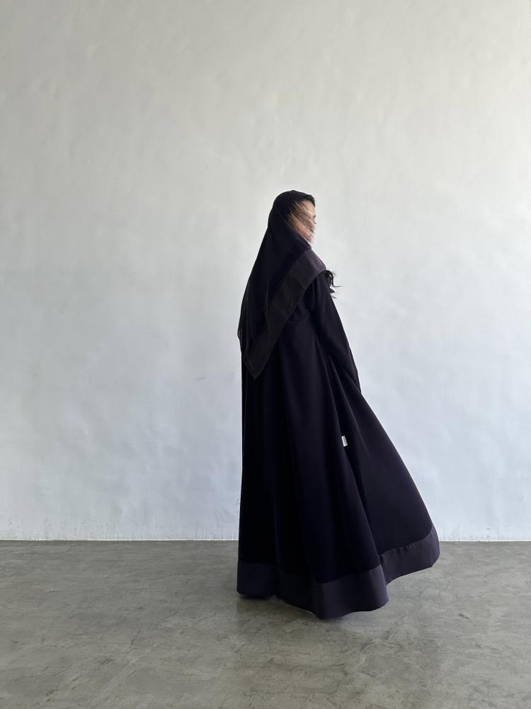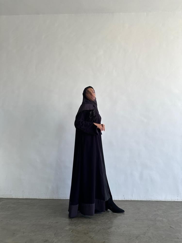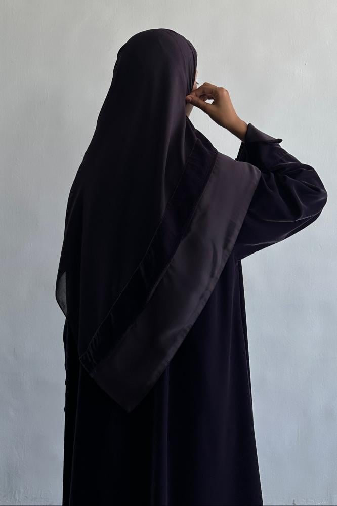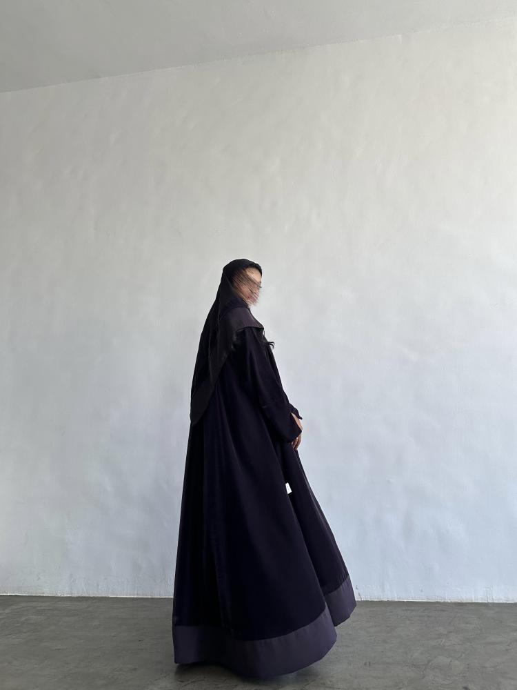 عباية مخمل كوري بنفسجي بطرف كريب بنفسجي قصة نص كلوش + طرحة بطرف مخمل وكريب