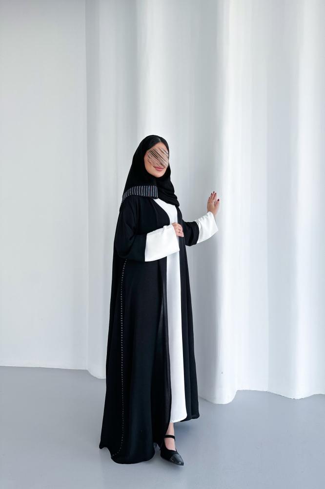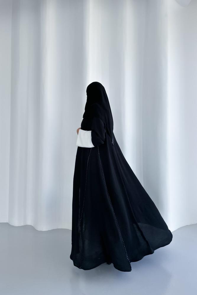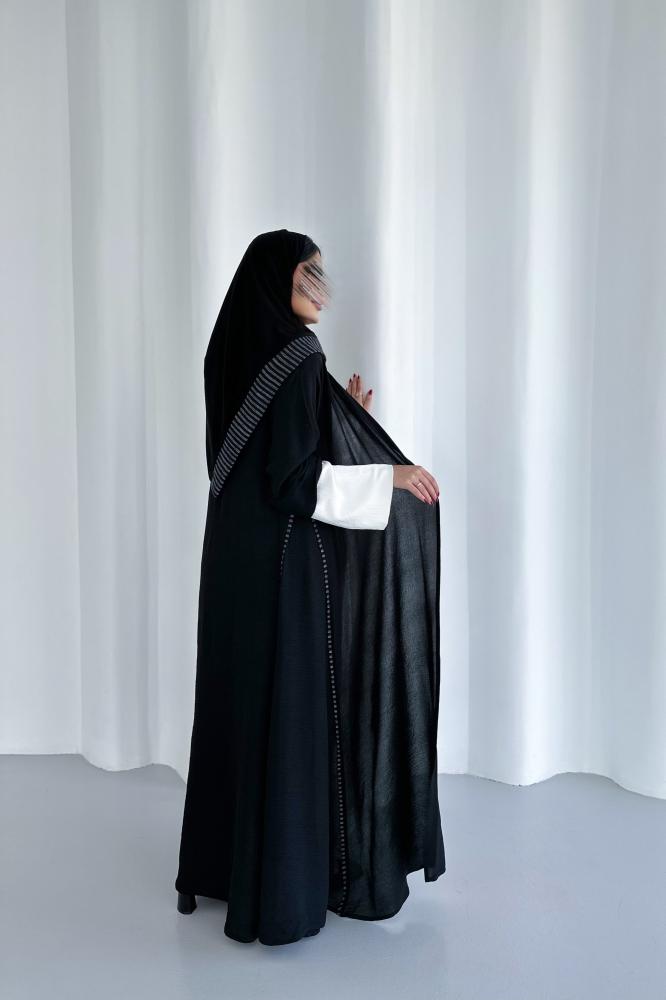 عباية لينن خفيف باللون الأسود والأكمام أبيض مع اضافة لينن مكرمش مقلم